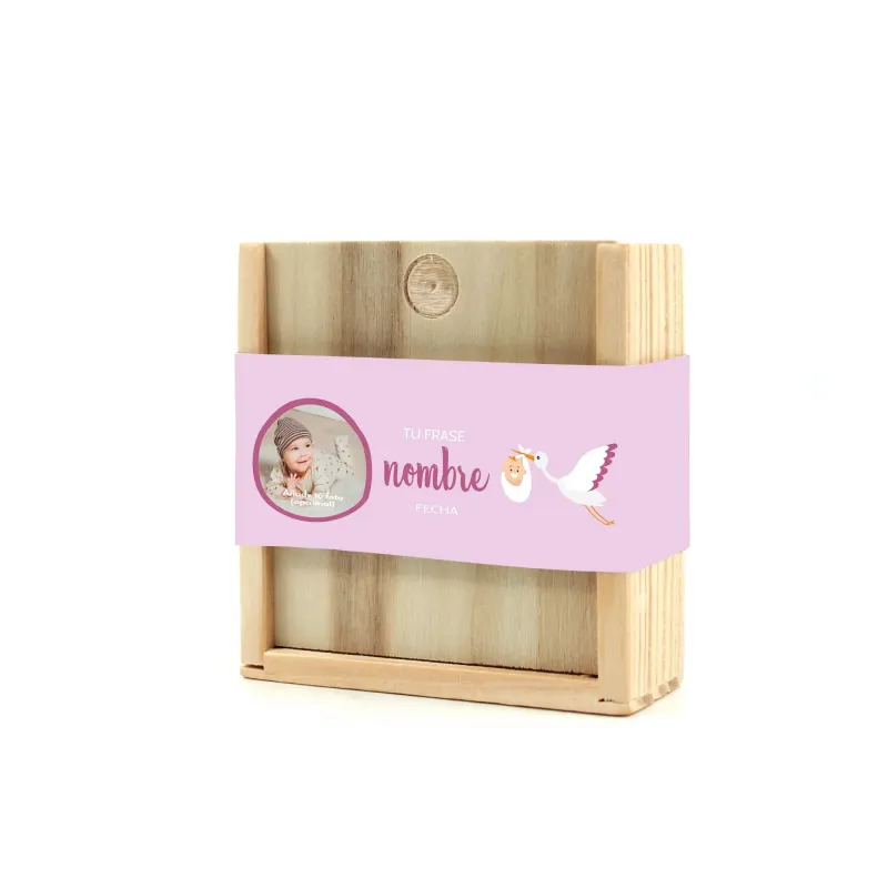 Divertido y entretenido set de juegos para detalles de bautizo. Presentado en una práctica caja de madera que incluye una baraja de naipes francesa en cartón reciclado y un dominó de madera.