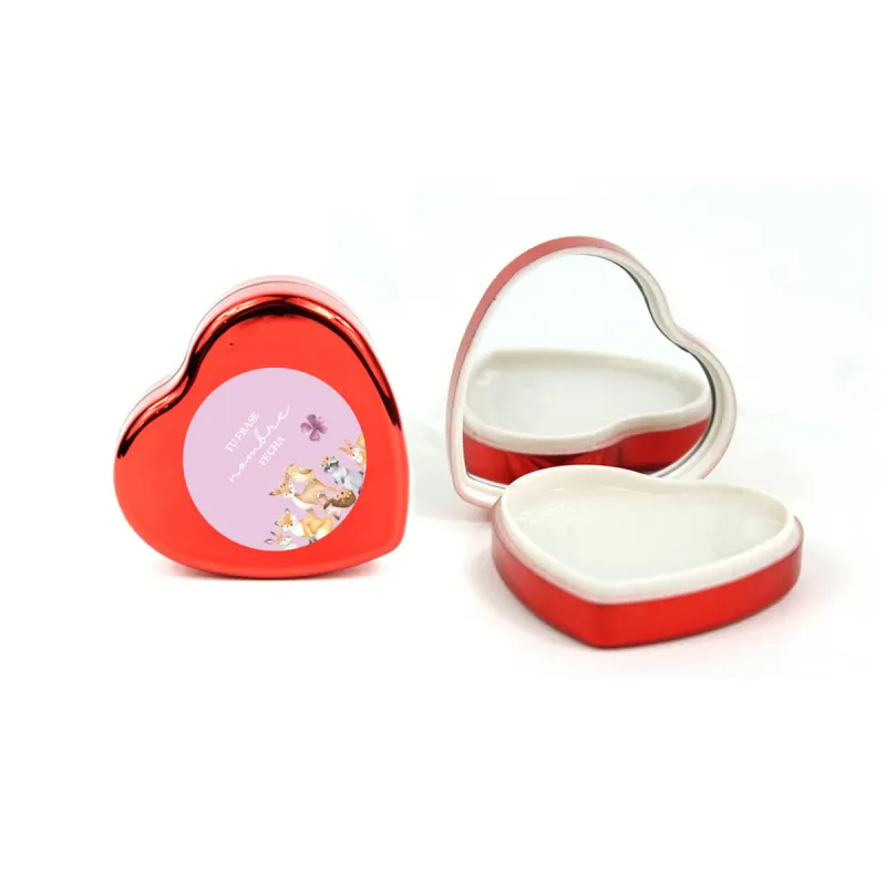Original y elegante bálsamo en forma de corazón con espejito que viene personalizado con una pegatina redonda con tu diseño único en la tapa superior para detalle de invitados de bautizo.