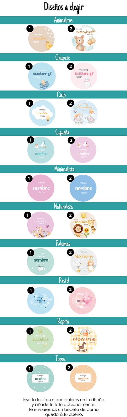 Personaliza tu producto seleccionando uno de nuestros diseños (o enviando el tuyo) y rellenando la información más abajo, si tienes cualquier cuestión no dudes en contactar. El precio ya incluye tu personalización a todo color especialmente creada para Bautizo.