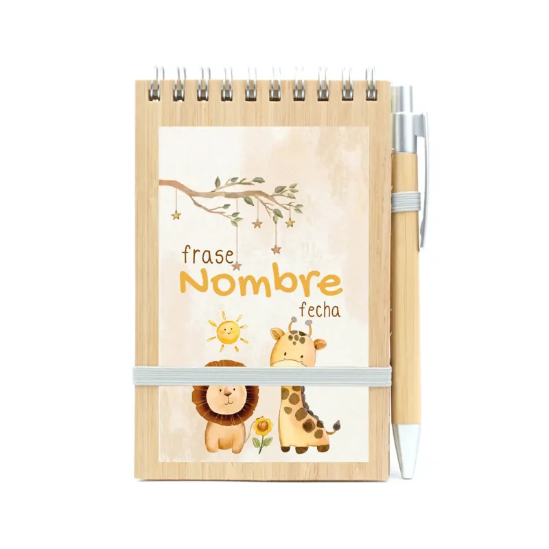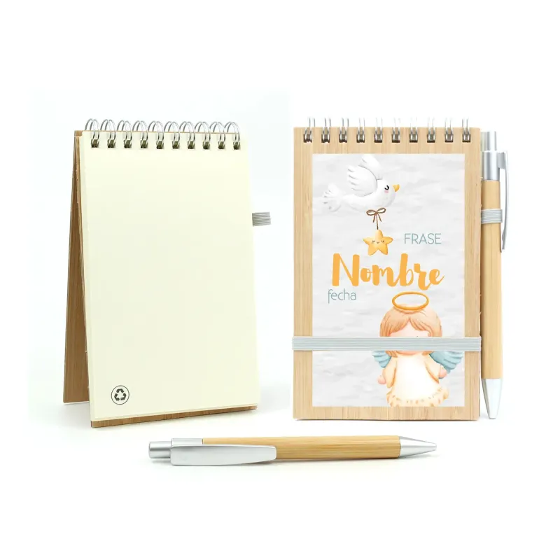 Si estás buscando un detalles originales de Bautizo que sea práctico, elegante y sostenible, nuestro Bloc de Notas y Bolígrafo de Bambú Personalizado para Bautizo es la opción ideal. Un regalo único que encantará tanto a niños como a adultos y que, además, transmitirá un mensaje de cuidado por el medioambiente.