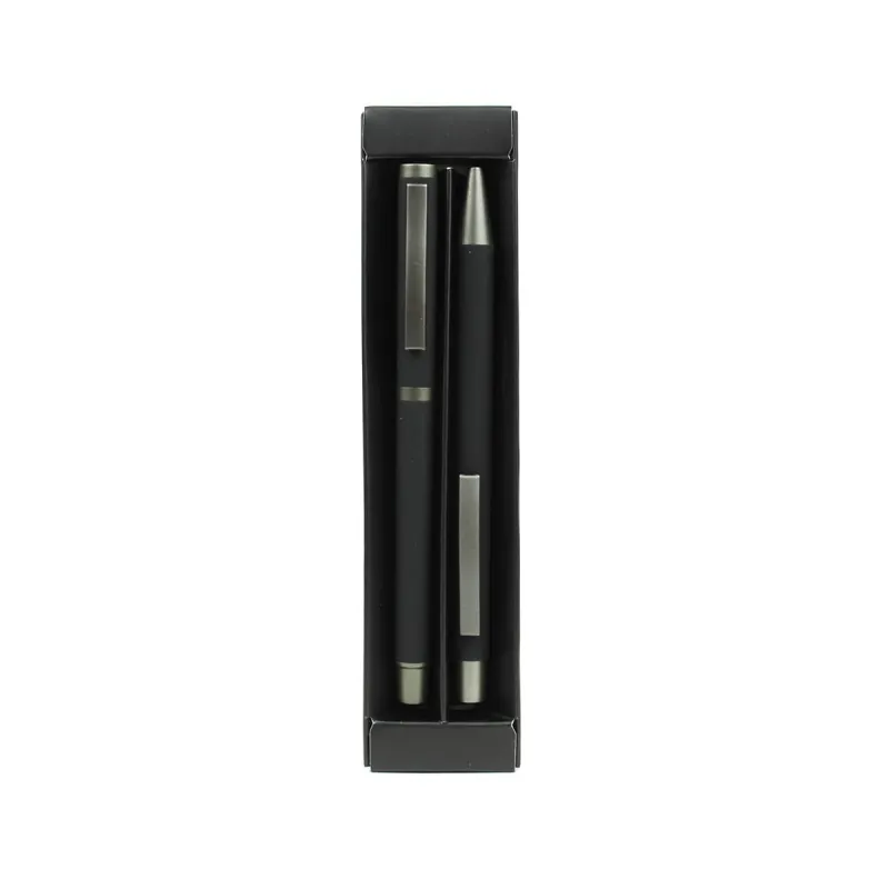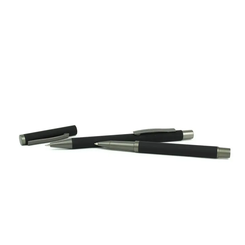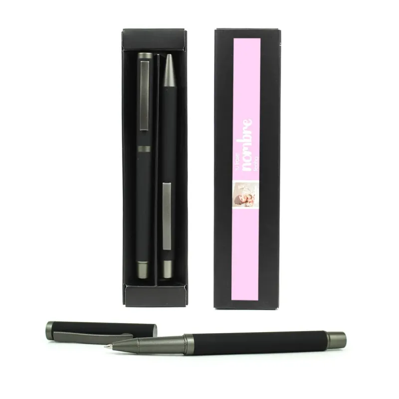 Si algo valoramos en los regalos para invitados de bautizo es que sean útiles y estéticamente bonitos. Este set de bolígrafo y roller cumple con creces ambas expectativas. Cada pieza está elaborada en un refinado color negro mate que aporta un aire sobrio y moderno, ideal para todo tipo de gustos y edades. Los detalles en gris metalizado añaden ese toque elegante que lo convierte en un artículo distinguido. La tinta de los bolígrafos es de color azul.