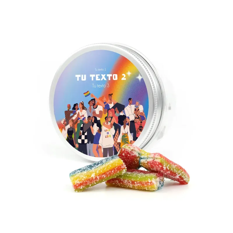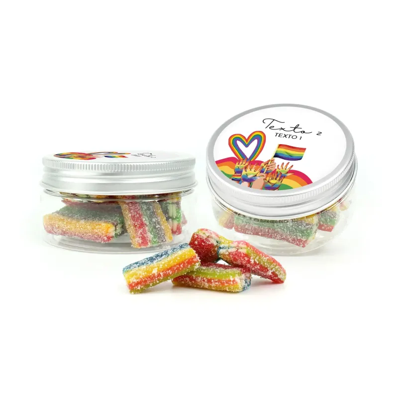 Deliciosas gominolas azucaradas llenos de color y sabor en bote con tapa de rosca.El detalle más dulce que puedes regalar este Mes del Orgullo con el que acertarás seguro y todo el mundo le encantará. Podrán reciclar el botecito tantas veces quieran. Estas gominolas serán el detalle ideal para cualquier evento que realices para el Día del Orgullo.