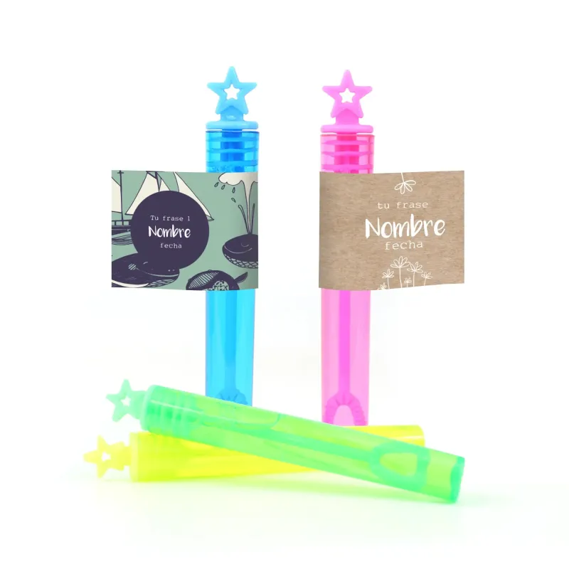 Burbujeros tubito con Estrella para comunión, elegantes pomperos para regalar a los invitados de comunión para que animen la fiesta lanzando miles de burbujas, aprovechando para hacer unas fotos espectaculares con los efectos que añaden las pompas a las imagenes. Medidas ideales para meterlo en un bolsillo. Si quieres puedes personalizar el burbujero con una bonita pegatina pegada en el cuerpo del burbujero como una banderita con el nombre de tus hija/hijo y la fecha.