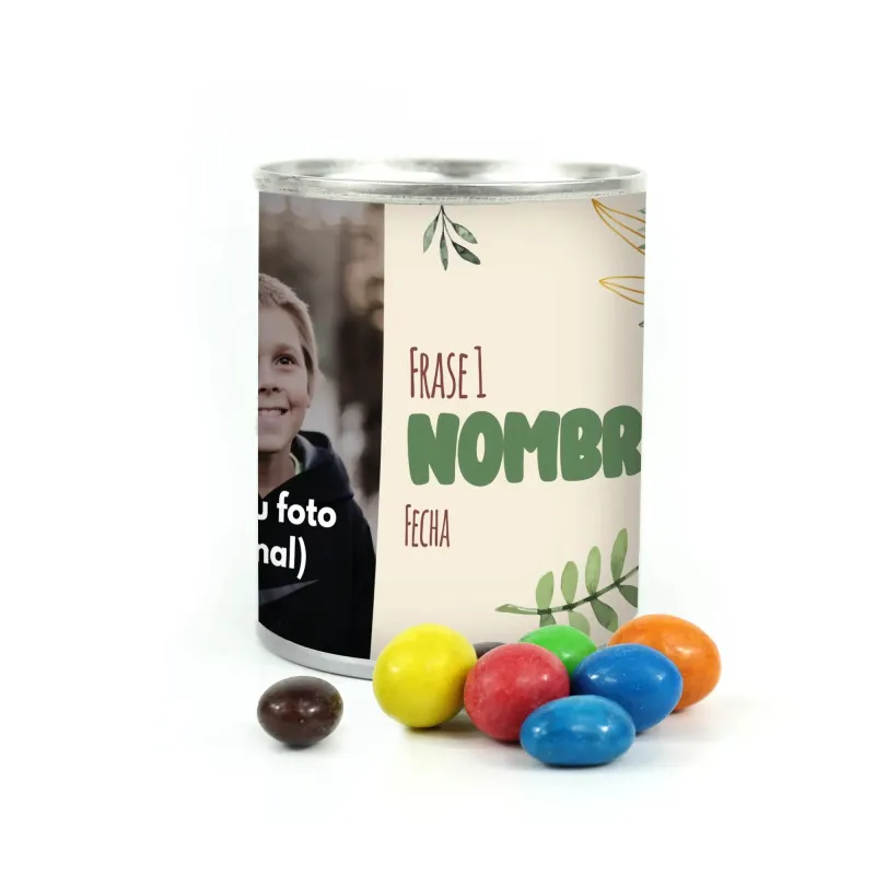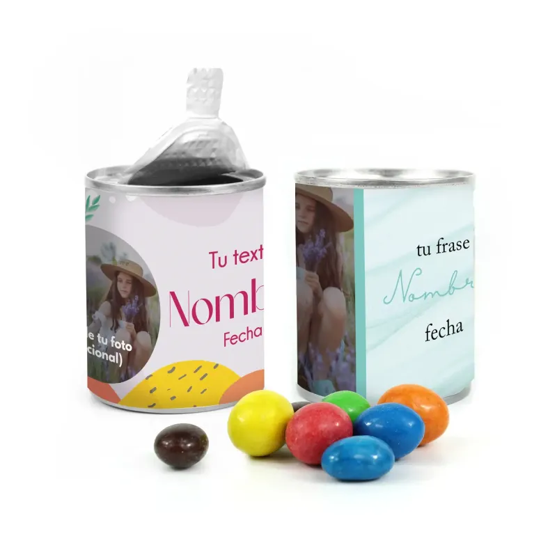 Deliciosos cacahuetes cubiertos de chocolate de colores para comunión, presentados en una latita abrefácil con etiqueta personalizada donde puedes añadir un nombre, fecha y una foto. La latita contiene 50 gramos de cacahuetes de colores y su sistema abrefácil facilita su apertura en cualquier lugar, también para los niños. Un regalo original y muy personal para poder ofrecer a los invitados de la comunión que también sirve como bonito recuerdo.
