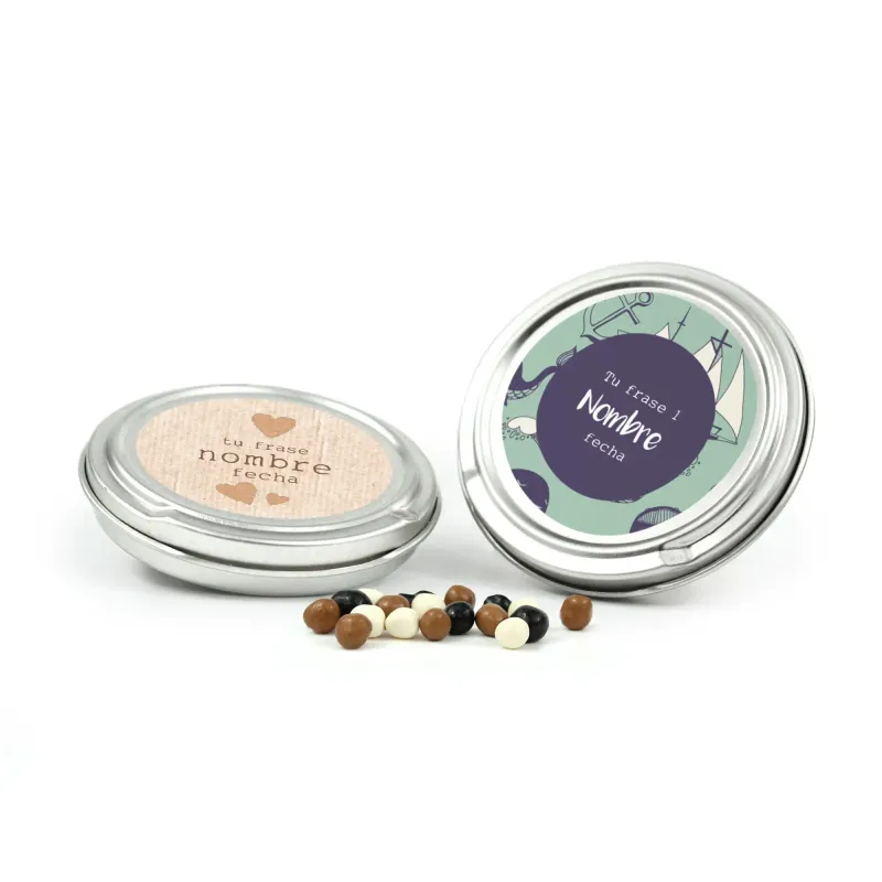 Excelente detalle para los invitados de la Comunión, una latita metálica redonda con personalización y apertura del tipo abre fácil rellena de un surtido de gominolas variadas con sabor a frutas. Los invitados del evento quedarán encantados con este dulce detallito que no fallará.