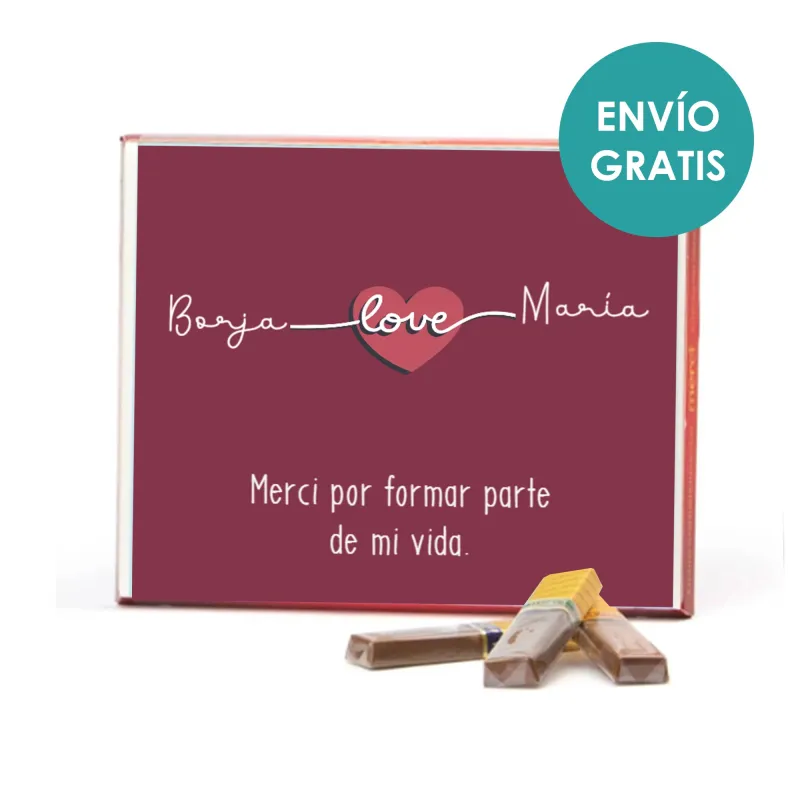 Celebra San Valentín de la forma mas original y bonita. Regala una caja de deliciosos chocolates Merci con tarjeta personalizada a todo color con el texto o frase que quieras. Surtido de 8 sabores de chocolate.