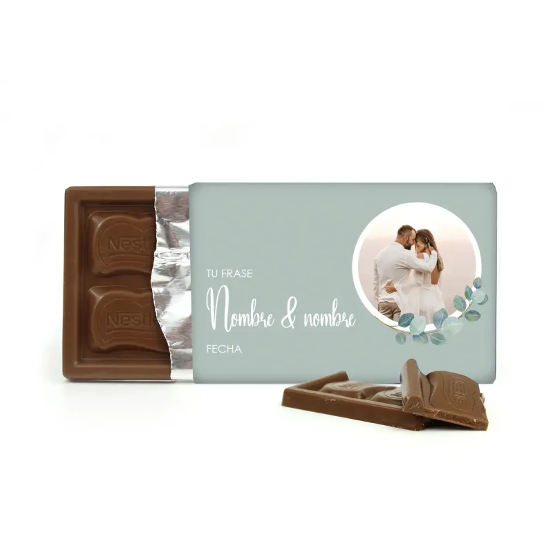 Una tableta de chocolate grande con envoltorio personalizado a todo color donde puedes añadir los nombres de los novios, fecha de boda y si quieres una foto para que tengas el detalle para los invitados de boda más original y personal. A quién no le gusta el chocolate?