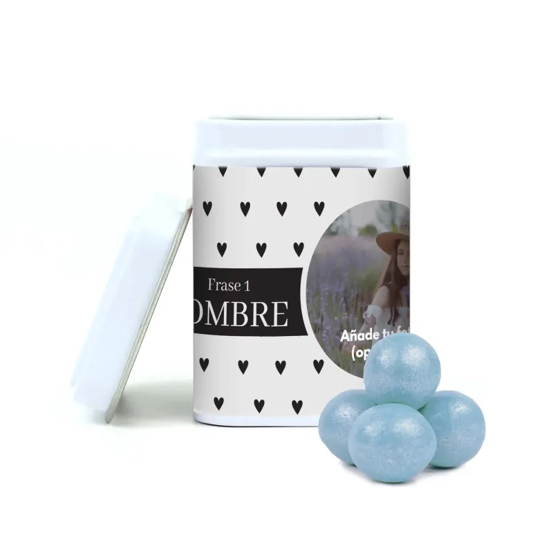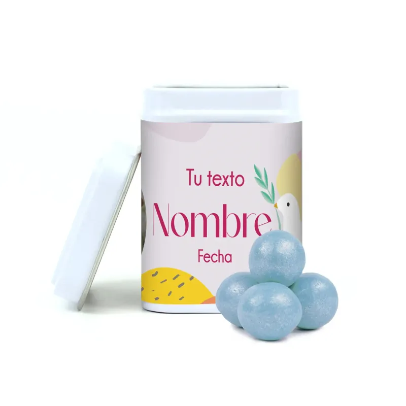 Esta pequeña lata metálica, disponible en color plata o blanco, cuenta con una tapa a presión y una etiqueta personalizada en el cuerpo con el diseño que elijas. En su interior, encontrarán 9 chocoperlas de cereal cubiertas de chocolate, con la posibilidad de seleccionar el color del chocolate entre blanco, azul o rosa. Un detalle que, además de encantar a los más golosos, tiene la ventaja de ser reutilizable, ya que la cajita puede tener múltiples usos después de disfrutar su contenido.