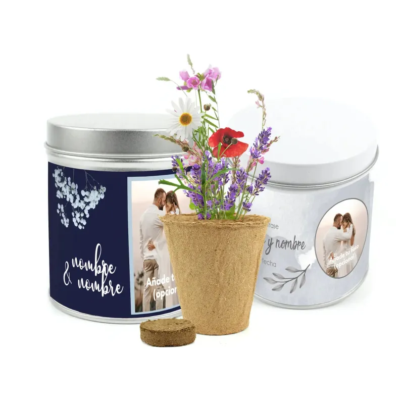 Completo set de cultivo de mezcla de flores listo para plantar. Con esta mezcla de semillas ayudarás a las abejas y mariposas a polinizar. Les encantará a todos tus invitados de la boda además de tener un bonito gesto con el medio ambiente.