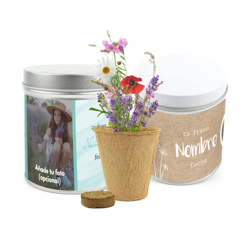 Se presenta en una lata con etiqueta personalizada a tu elección donde puedes añadir el nombre de tu hijo/a, fecha de Comunión y si quieres una foto. El set viene listo para plantar con una turba de tierra prensada, una macetita, tarjetita instrucciones y las semillas de Flor No Me Olvides.