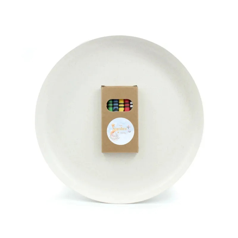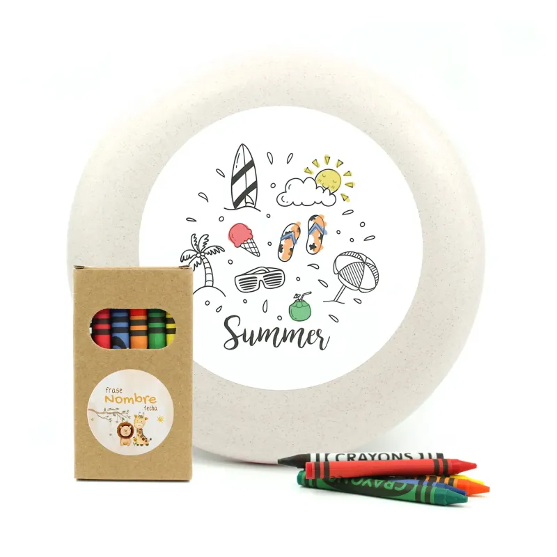 Original frisbee para colorear con ceras fabricado en caña de trigo con personalización. Viene con un conjunto de 6 ceras en varios colores con el que se puede colorear el original dibujo que lleva el frisbee. La personalización es una pegatina redonda en la cajita de ceras. El conjunto viene presentado en una bolsa de celofán transparente.