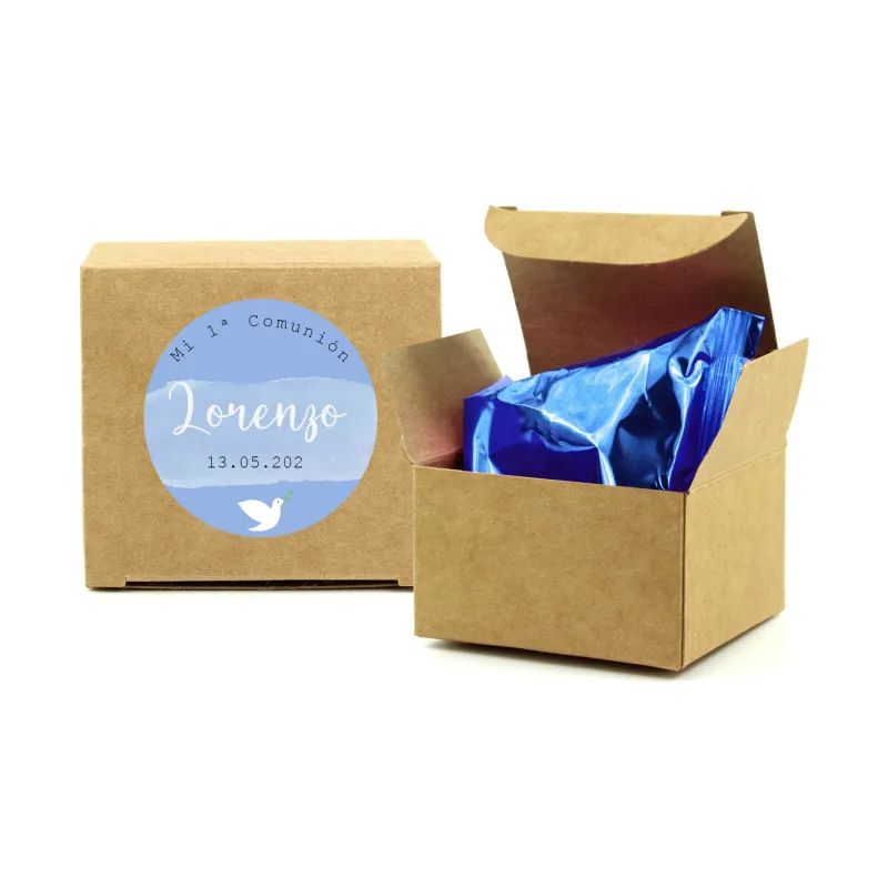 Si buscas un detalle original, elegante y comestible para sorprender a los invitados o clientes, la galleta de la suerte en cajita kraft es un acierto seguro. Su presentación en una elegante cajita regalo kraft, una galleta de la suerte con un proverbio popular en su interior hacen único a este detalle para invitados a la comunión. Las galletas de la suerte se sirven en surtidos de más de 40 proverbios populares y a la cajita se le añade una pegatina personalizada a todo color.