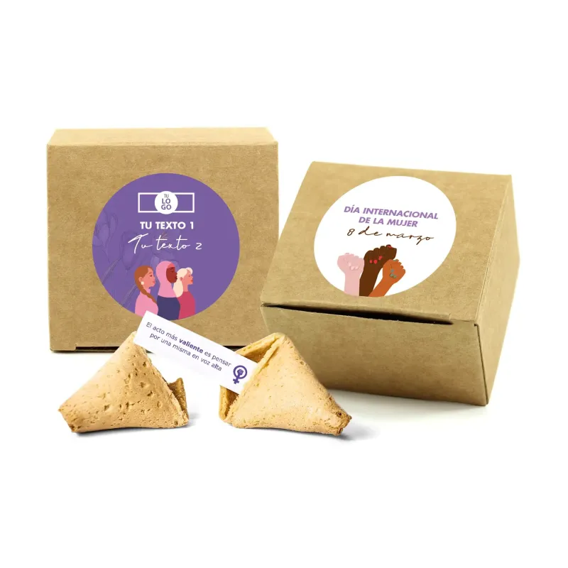 Una de las grandes ventajas de nuestras galletas de la suerte es su opción de personalización. Puedes elegir entre nuestros diseños exclusivos para el Día de la Mujer o enviarnos tu propio diseño para que lo incluyamos en la pegatina de la cajita. De este modo, podrás adaptar este detalle a la identidad de tu empresa, organización o evento.
