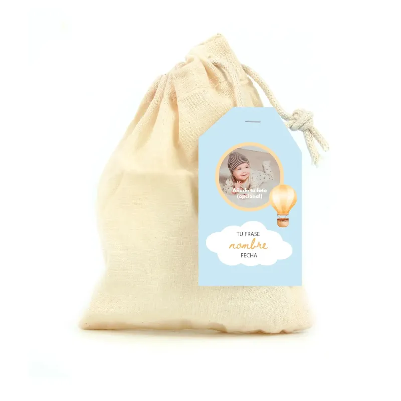 Personalizada con una tarjetita para detalle bautizo grapada, puedes elegir entre los diseños que tenemos añadiendo nombre, fecha y foto si quieres.