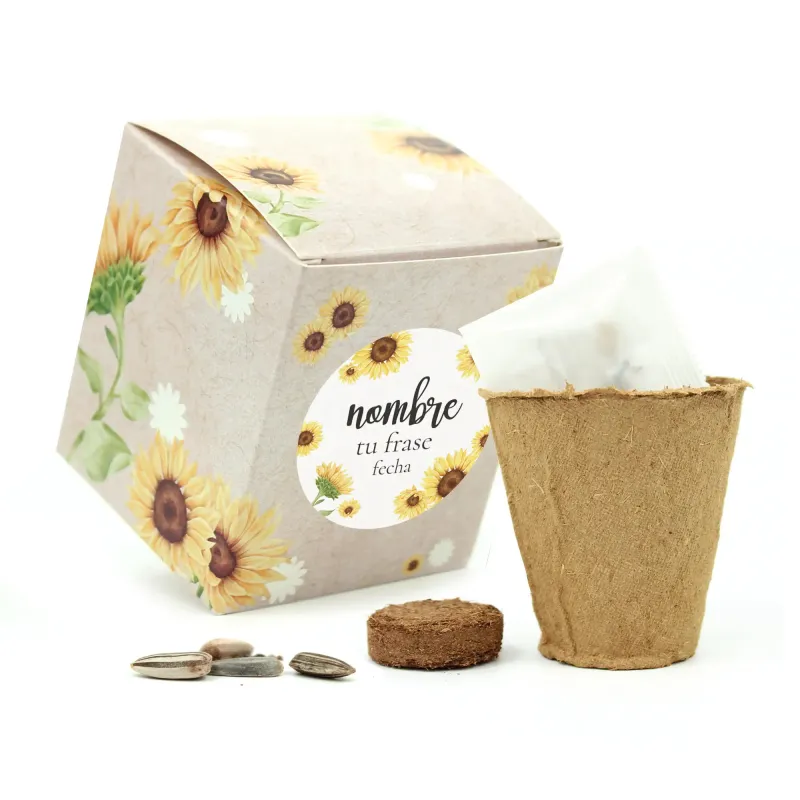 Este kit de cultivo no solo sorprende por su presentación, sino también por su enfoque sostenible. La fibra de coco de la maceta es biodegradable, y las semillas girasoles están seleccionadas para garantizar una germinación exitosa. La cajita de cartón, con medidas de 6 x 6 x 7 cm, es resistente y perfecta para guardar como recuerdo. Además, al personalizarla con el nombre del niño o niña, se convierte en un detalle comunión personalizado único.