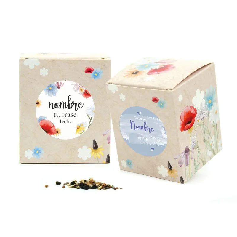 La cajita personalizada incluye todo lo necesario para cultivar un pequeño jardín: semillas variadas, turba comprimida y una encantadora macetita de fibra de coco. Además, la tarjeta con instrucciones garantiza que hasta los menos expertos en jardinería puedan disfrutar del proceso. Es un detalle invitados comunión que transmite valores como el cuidado, la paciencia y la belleza de lo natural.