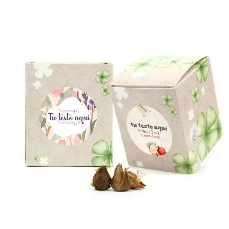 La cajita personalizada incluye todo lo necesario para cultivar un pequeño jardín: bulbos de trébol, turba comprimida y una encantadora macetita de fibra de coco. Además, la tarjeta con instrucciones garantiza que hasta los menos expertos en jardinería puedan disfrutar del proceso. Es un detalles regalos para alumnos que transmite valores como el cuidado, la paciencia y la belleza de lo natural.