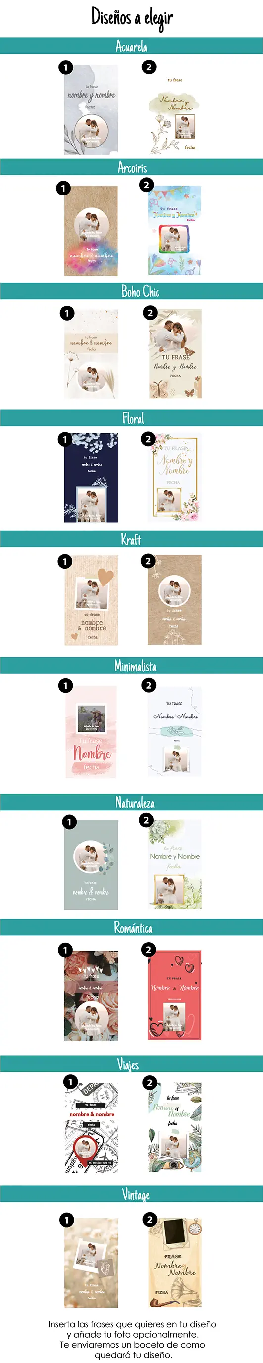 Personaliza tu producto seleccionando uno de nuestros diseños (o enviando el tuyo) y rellenando la información más abajo, si tienes cualquier cuestión no dudes en contactar. El precio ya incluye tu personalización a todo color especialmente creada para Boda.