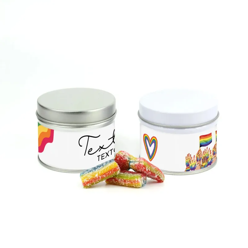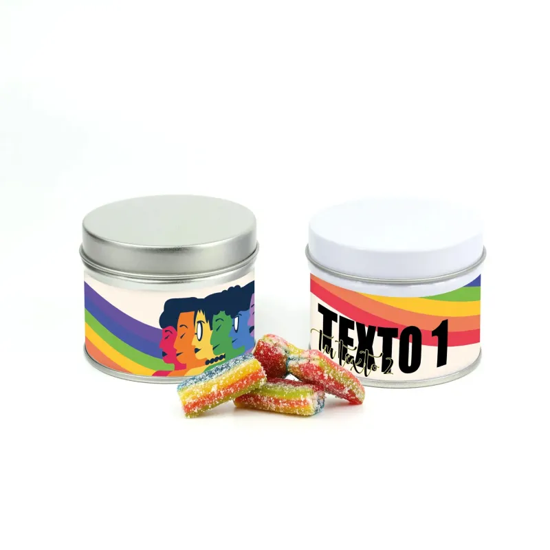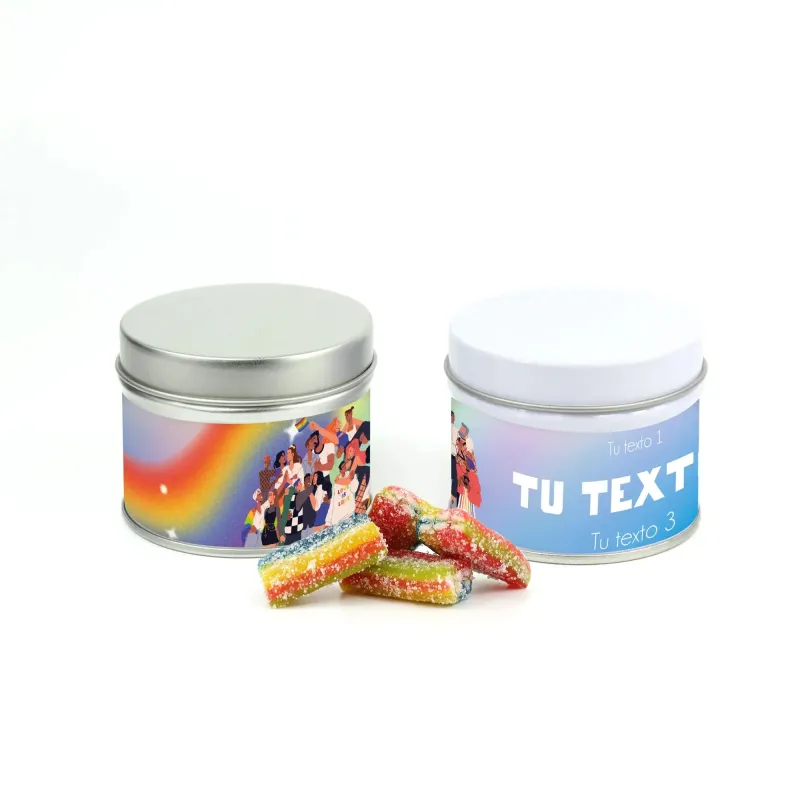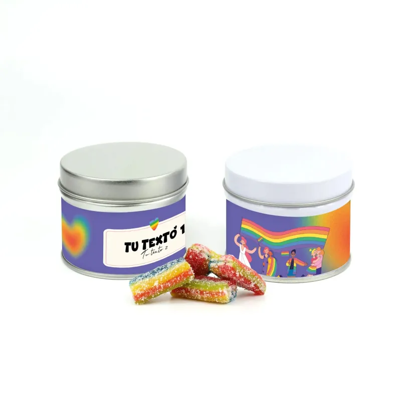 Pequeño detalle para el Mes del Orgullo. Latita rosca personalizada rellena de mini chocolates de colores. El detalle perfecto para aquellos amantes del chocolate e ideal para regalar en este Mes del Orgullo.
