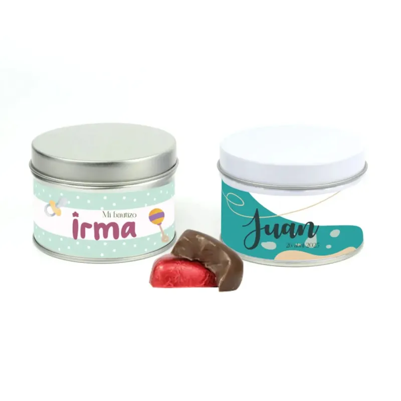 Corazones de chocolate de primera calidad en una lata con etiqueta personalizada, un detalle para tus invitados del bautizo.