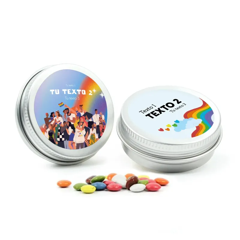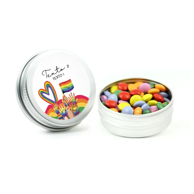 Pequeño detalle para el Mes del Orgullo. Latita rosca personalizada rellena de mini chocolates de colores. El detalle perfecto para aquellos amantes del chocolate e ideal para regalar en este Mes del Orgullo.