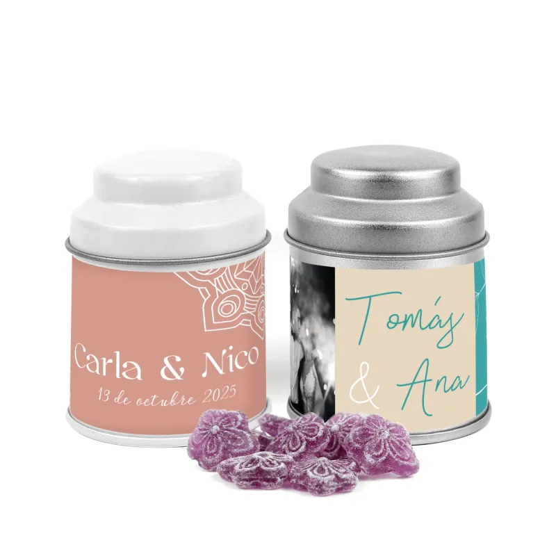 En nuestro catálogo de caramelos para bautizo podrás encontrar las violetas en otras presentaciones: Latita cuadrada con violetas o Latita tapa rosca personalizada con violetas para boda.