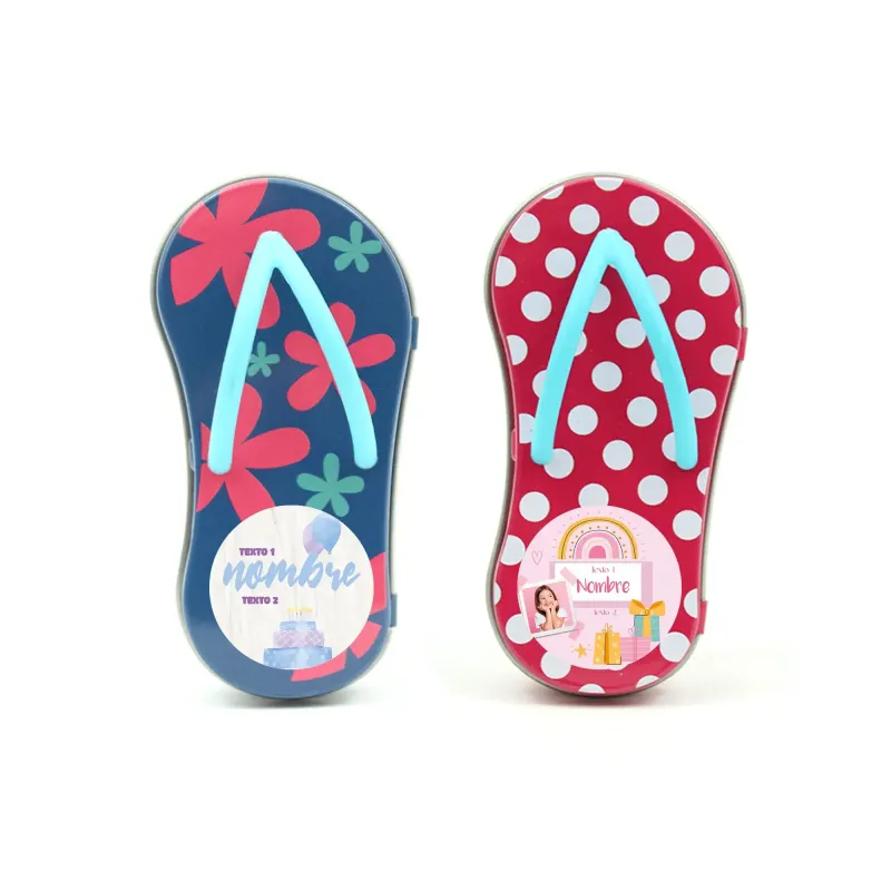 La cajita con forma de chancla viene personalizada con una pegatina redonda con tu diseño único.