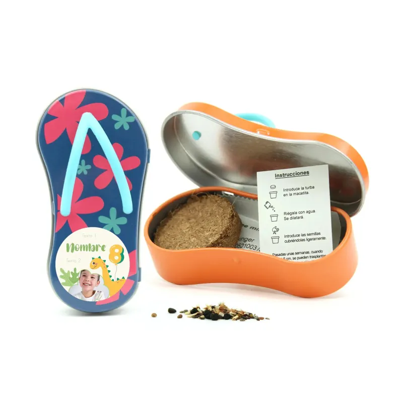 Original y divertido detalle de cumpleaños. Una cajita metálica en forma de chancleta de playa rellena de un kit de plantación de flores a elegir. La chancletita está personalizada con el nombre, la fecha y una frase con el diseño que escojas en una pegatina redonda en la tapa superior de la cajita.