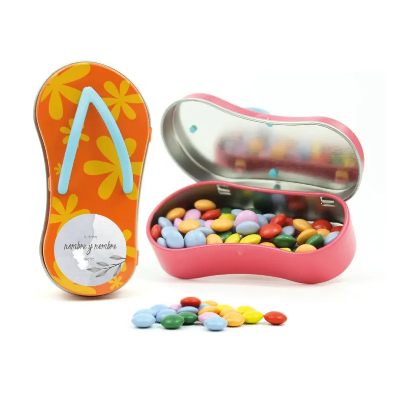 Novedoso y original detalle para boda. Pequeña cajita metálica en forma de chancleta playera, rellena de deliciosas mini grageas de chocolate de colores. Un regalo para los invitados al enlace muy original y que no olvidarán fácilmente. Se guardarán la cajita para futuros usos.