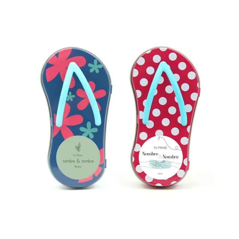 Original y divertido detalle de boda. Una cajita metálica en forma de chancleta de playa rellena de caramelos violeta. La chancletita está personalizada con los nombres, la fecha y una frase con el diseño que escojas en una pegatina redonda que va pegada en la tapa superior de la cajita.