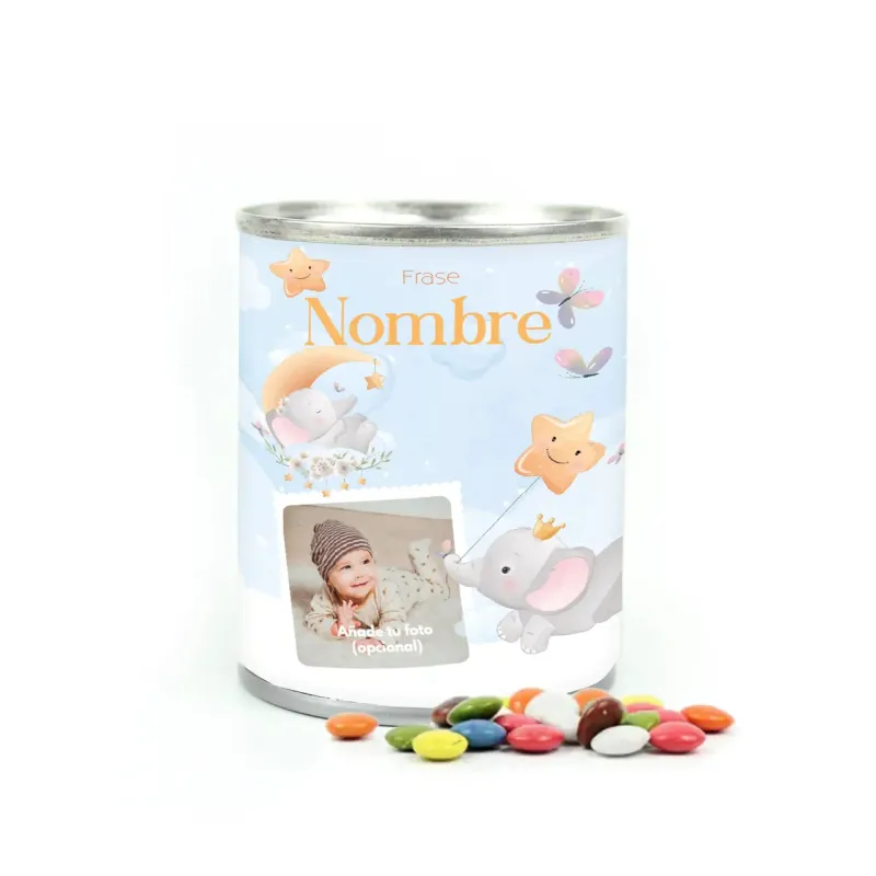 Disponemos de otras opciones de relleno como la latita cuadrada rellena de divertidos Jelly Beans personalizda para baby shower, como chuches. Si prefieres puedes darle un vistazo a toda nuestra oferta de productos únicos para detalles baby shower y hacer que los invitados de eventos queden encantados.