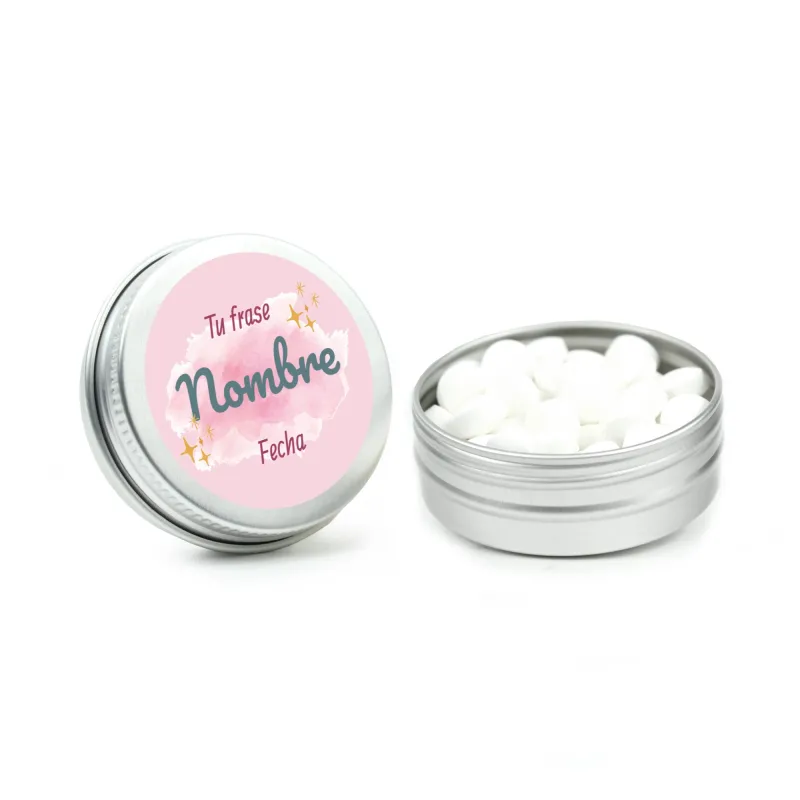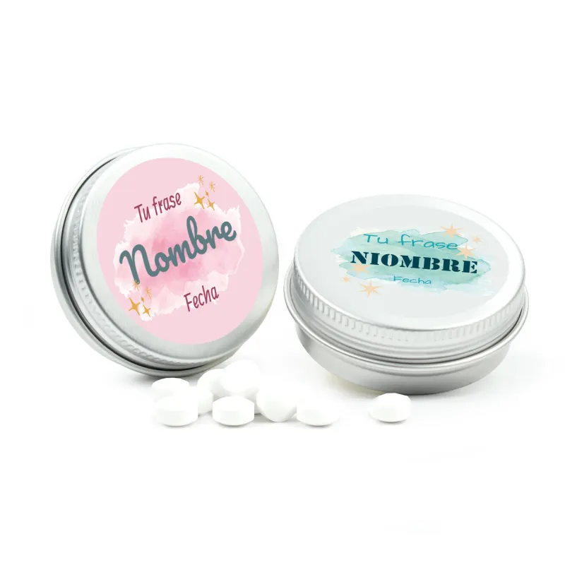 Latita con tapa de rosca y rellena de los mejores mini chocolates de colores, un detalle muy original para regalar a los invitados al bautizo o fiesta de nacimiento de tu bebé. Se puede personalizar con una pegatina hecha por ti, eligiendo uno de nuestros diseños a los que puedes añadir el nombre de tu bebé, fecha de nacimiento o bautizo