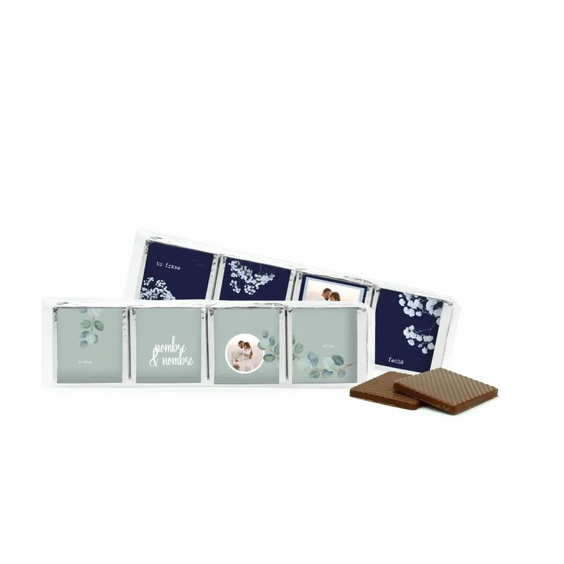 Las napolitanas están elaboradas con un delicioso chocolate con leche de primera calidad que encanta tanto a pequeños como a mayores. Cada unidad mide 3,5 x 3,5 cm, el tamaño ideal para disfrutar de un pequeño bocado dulce sin excesos. Además, el envoltorio de cada chocolatina se personaliza a todo color con el diseño que elijáis, incluyendo nombre, fecha y el estilo gráfico que más os guste: clásico, moderno, tierno o divertido.