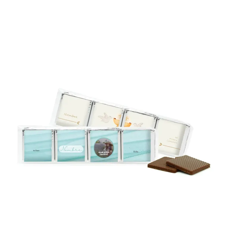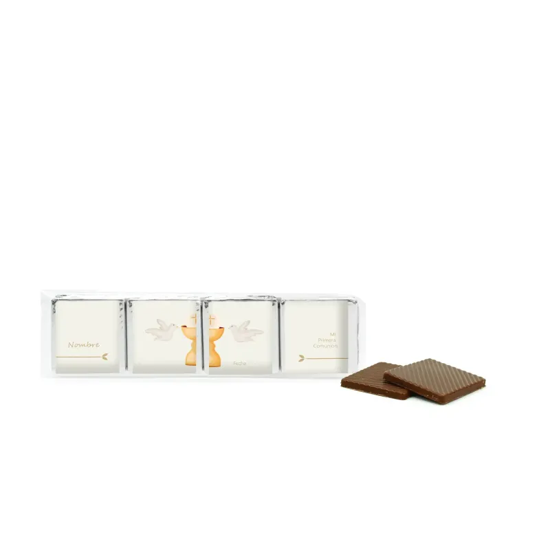 Este pack de cuatro napolitanas de chocolate viene presentado en una elegante bolsita de celofán, cuidada hasta el más mínimo detalle. Su tamaño compacto y la calidad del envoltorio hacen que sea un regalo vistoso y muy práctico para entregar a familiares y amigos durante la Comunión. Una opción que combina buen gusto, personalización y dulzura en partes iguales.