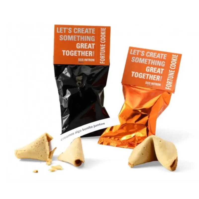 Las galletas de la suerte personalizadas son el detalle perfecto para cualquier ocasión especial. Ahora, además de personalizar su presentación con una topcard impresa a doble cara, también puedes crear tus propios mensajes para el interior de cada galleta. Una opción ideal para eventos corporativos, celebraciones privadas o campañas promocionales, garantizando un impacto inolvidable en cada apertura.
