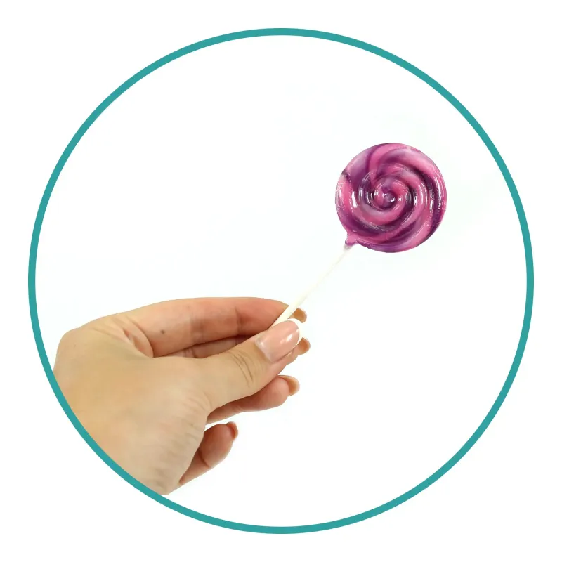 Las Piruletas Twist Personalizadas destacan por su atractivo diseño en espiral, su color morado y su delicioso sabor a limonada. Cada piruleta viene envuelta en un envoltorio transparente que permite lucir su colorido aspecto, y se personaliza con una pegatina redonda impresa a todo color, pegada en una de sus caras.