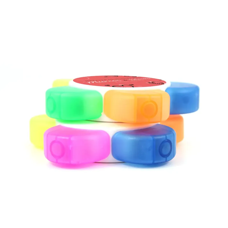 Divertido y práctico botecito con 5 rotuladores fluorescentes (azul, verde, rosa, naranja y amarillo) .En bote tipo caramelera. Ideal como regalo de boda para niños.