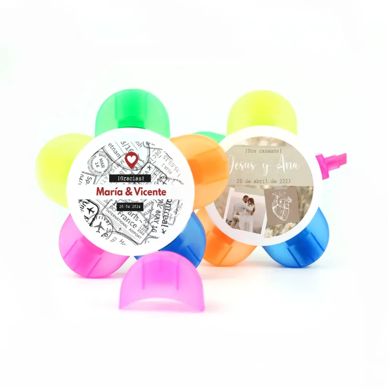 Igualmente, los rotuladores fluorescentes están disponibles en otro formato con el Botecito con rotuladores personalizado detalles boda, que siempre tendrán a mano en su escritorio.