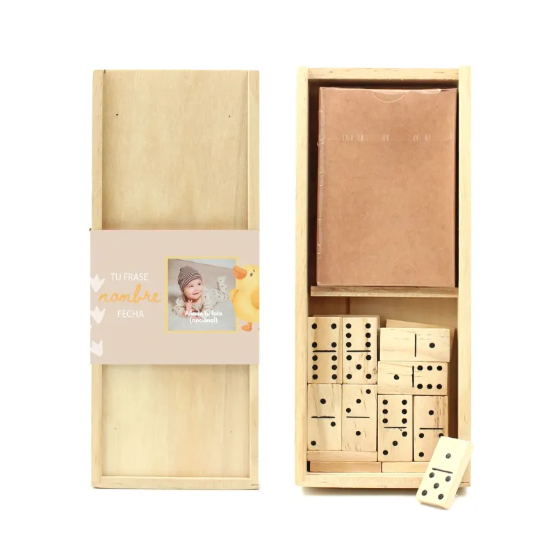 Elegante y divertido juego en caja de madera con una baraja francesa y dados de madera. Un detalle bonito, personalizado y elegante que encantará a todos tus invitados que tendrán durante mucho tiempo ya que con las medidas compactas de la cajita podrán guardarlo en cualquier lugar.