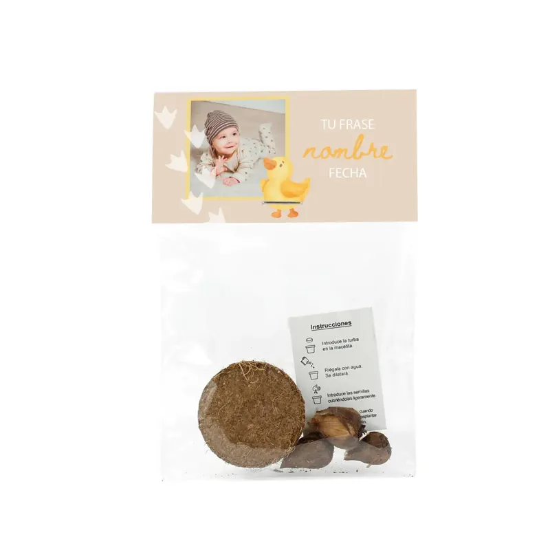Set de Cultivo en bolsita kraft personalizada para baby shower. Completo set de cultivo presentado en una bolsita kraft, personalizada con una pegatina a todo color con el nombre de tu hijo/a, fecha del evento o nacimiente, y si quieres una foto (según modelo de pegatina). Contiene semillas a elegir entre trébol, flores no me olvides, margaritas, amapolas o girasoles, turba de tierra prensada y una macetita.