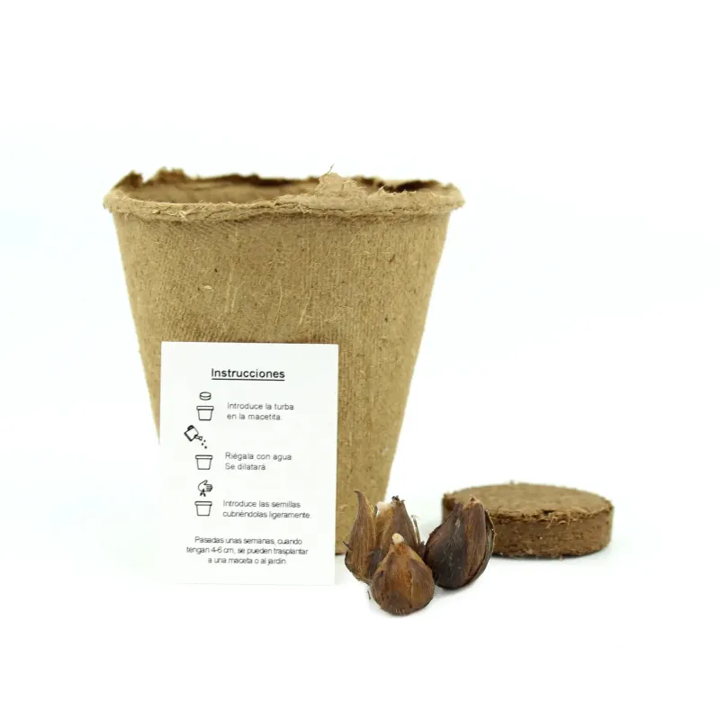Completo Set de cultivo con 3 Bulbos de Trébol de cuatro hojas, macetita y una pastilla de tierra prensada listos para plantar. Presentado en una elegante cajita kraft personalizada con una pegatina a todo color con el diseño, texto, imagen o logotipo que quieras