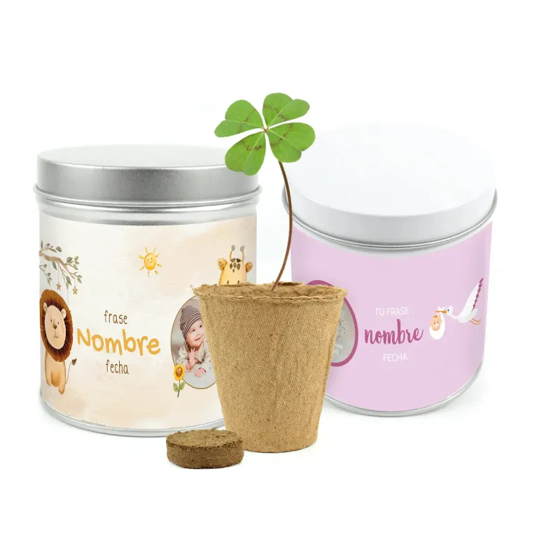 Completo set de cultivo de trébol de cuatro hojas presentado en una original lata con etiqueta personalizada para obsequiar a los invitados al baby shower. Elige el diseño de etiqueta que más te gusta y añade el texto que quieras. La mejor manera de repartir suerte entre tus invitados!