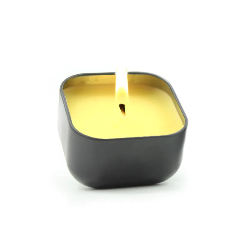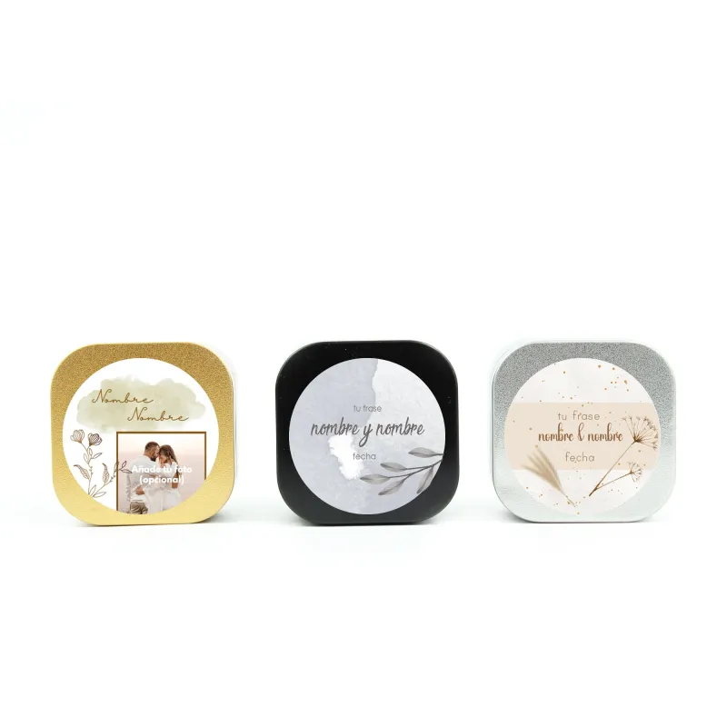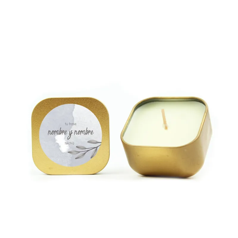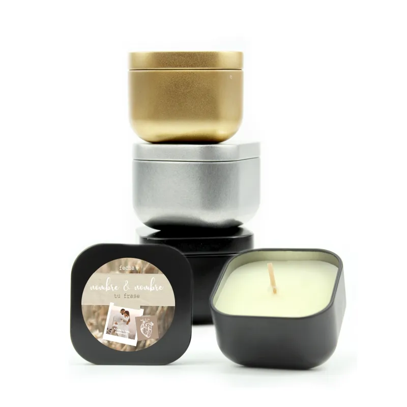 Nuestra vela está presentada en una preciosa latita metálica cuadrada con acabado metalizado, esquinas redondeadas y tapa a presión, que podrás elegir en color dorado, plateado o negro. Además, su diseño elegante y minimalista se adapta a cualquier temática, permitiendo personalizar la tapa con un diseño exclusivo que refleje el estilo de la celebración.