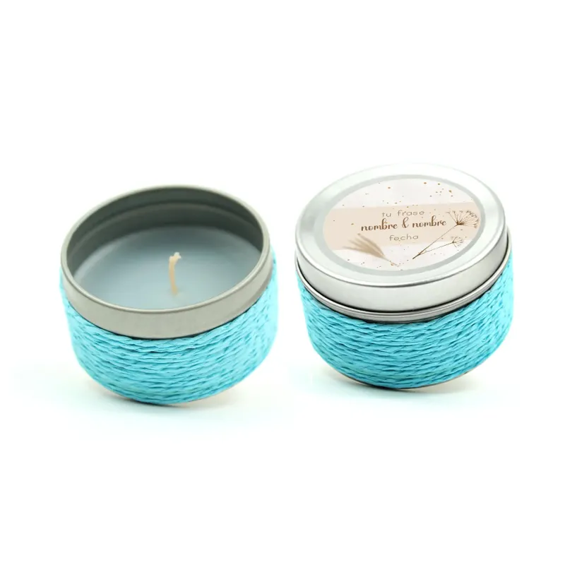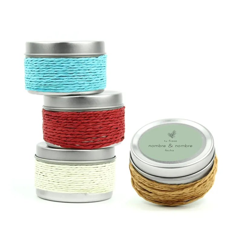 Estas velas están presentadas en una latita metálica redonda con tapa a presión, lo que garantiza su protección y conserva el aroma por más tiempo. La cuerda de yute que rodea el envase añade un aire rústico y elegante, ideal para celebraciones con un estilo natural y cuidado.